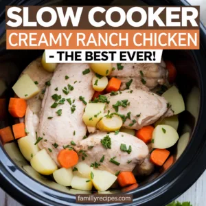 The easiest dinner ever! Just 3 ingredients—chicken, ranch seasoning, and cream of chicken soup—cooked in the crockpot until tender and creamy. Perfect lazy dinner!