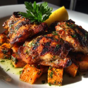 Grilled chicken thighs marinated in fresh herbs paired with golden roasted sweet potatoes. Ready in 45 minutes with 36g protein per serving.