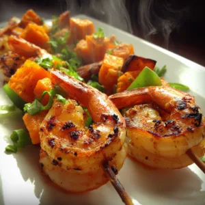 Serve skewers hot with roasted sweet potatoes, garnished with fresh parsley and lemon wedges.