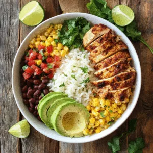 A clean-eating, high-protein burrito bowl made with lean chicken, brown rice, beans, and avocado. Balanced, macro-friendly, and perfect for weekly meal prep lunches.
