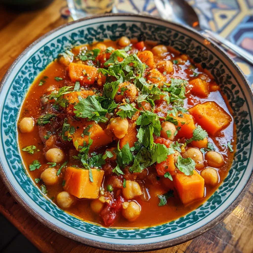 Chickpeas, tomatoes, and sweet potatoes slow‑cooked in Moroccan spices — a healthy, plant‑based crockpot stew rich in flavor and fiber.